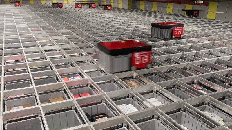 Steven Kersbergen van het bedrijf Fulfilment Solutions is zeer te spreken over zijn nieuwe robots, die bestellingen van webshops afhandelen. “Voorheen waren de medewerkers 70 procent van de tijd aan het lopen.” “Nu hebben we een systeem waarbij de goederen naar ons toe komen, in plaats van dat wij naar de goederen toe moeten”, zegt Kersbergen. “Binnen vijf seconden na de muisklik waarmee je thuis een aankoop bevestigt, gaan hier de karretjes rijden. We doen twee keer zo veel werk als een jaar geleden, met hetzelfde aantal mensen.”